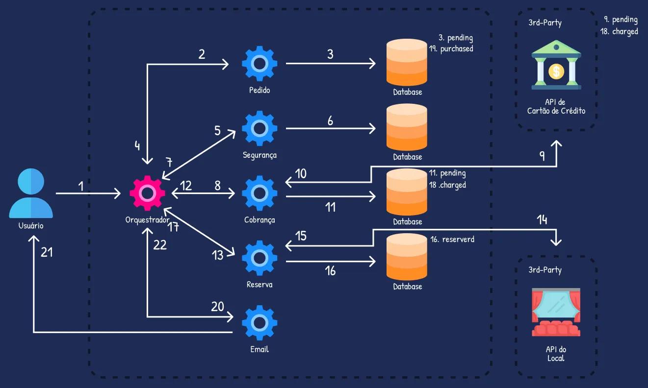 - Caso a resposta seja negativa (as vezes o assento já foi comprado em outra plataforma) ou erro, o serviço de reserva devolve essa resposta para o orquestrador, que avisa o pedido de cobrança para cancelar a transação pendente e o serviço de pedido para cancelar o pedido pendente, além de retornar o cancelamento para o usuário.